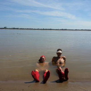 | Mark and David celebrated their 40th marathon on a Red Sock Friday with a swim in the Mekong. ShoOops! |
